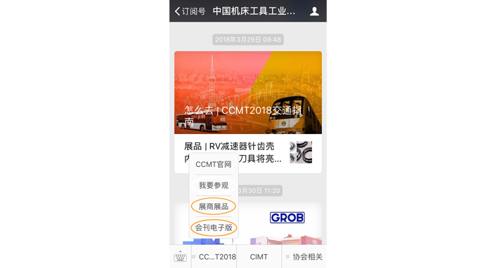 进入微信订阅号,点开底部菜单,发现“展商展品”和“会刊电子版”,任意浏览~~