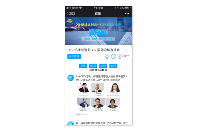 作为CCMT2018开幕重头戏的“2018机床制造业CEO国际论坛”专题直播间今天正式上线了!