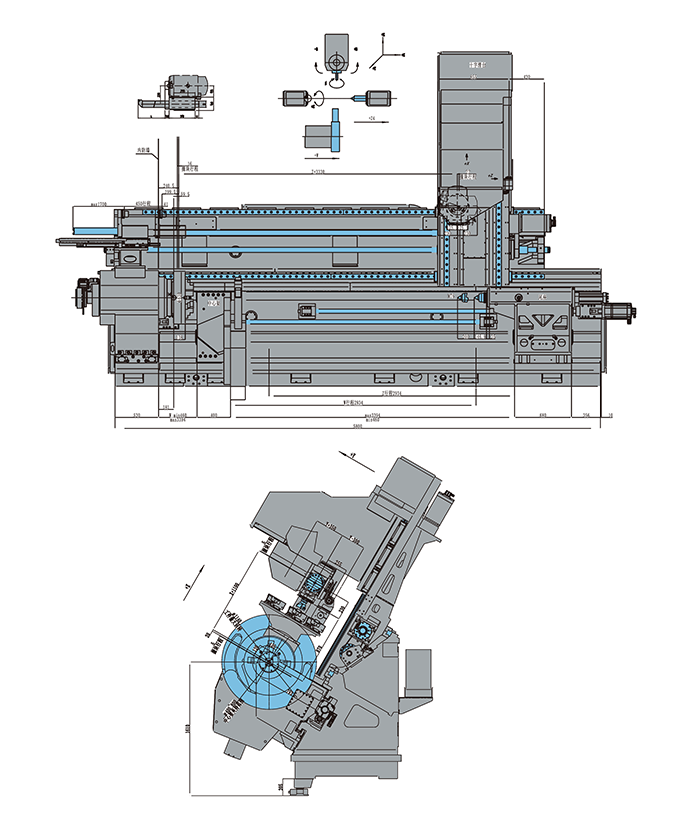 整机结构经过优化设计,具有更大的作业空间、更小的干涉、更强的切削刚度、更紧凑的安装空间。该机床总体布局为60°斜床身立柱移动式,设计合理,排屑顺畅。斜床身结构使得摆头到床身距离最短,摆头刚性最大,实现良好的强力车削。床身采用高性能铸铁材料,具有良好的静态、动态、热态刚度,动柱直线导轨配有6个滑块,使机床车削主轴到床身拥有较好稳定性和力学传递。机床为箱型结构,合理布筋,厚筋板,提高床身可承受的静、动能扭曲及变形能力。